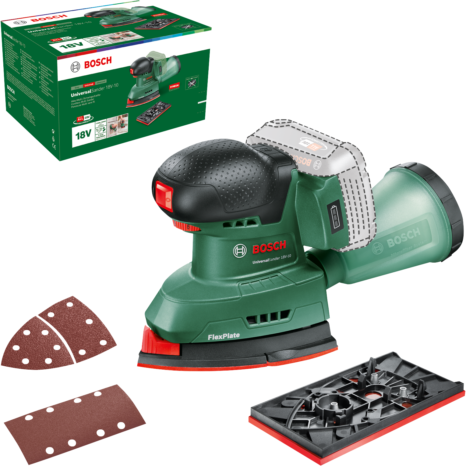 Akumulátorová bruska UniversalSander 18V-10 je vybavena deskou ve tvaru žehličky na práci v těsných rozích a na okrajích a obdélníkovou deskou na střední až velké rovné plochy. Elektronická předvolba otáček zajišťuje správné nastavení rychlosti pro danou práci a materiál. Nástavce je možné rychle vyměnit díky systému SDS. Bruska je ideální na práci se dřevem a nalakovanými a natřenými povrchy, jako je nábytek, dveře, rámy apod. Snadno odnímatelná mikrofiltrační nádoba na prach snižuje množství prachu a udržuje pracovní prostor v čistotě. Zabudovaná technologie Bosch Syneon poskytuje optimální výkonnost a maximální dobu chodu. Toto nářadí patří do systému 18V POWER FOR ALL. Jeden akumulátor lze používat s veškerým nářadím 18V POWER FOR ALL.